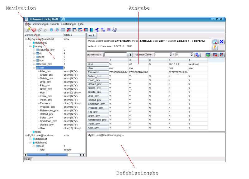 Die Oberfläche teilt sich in die Bereiche "Navigation", "Ausgabe" und "Befehlseingabe".