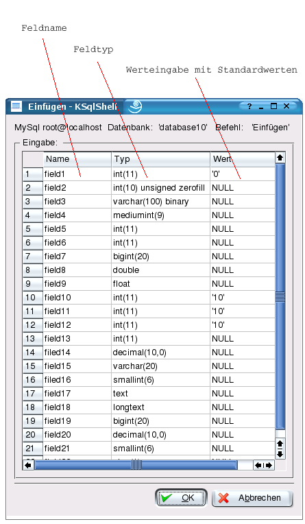 Das Dialogfenster enthält eine Liste mit Namen und Typen der Felder sowie die Werteingabe. Sind Standardwerte für Felder der Tabelle vorgegeben worden, so erscheinen diese beim Aufruf des Dialoges unter "Wert". In Abhängigkeit vom Feldtyp sind Anführungszeichen zu setzen (z.B. 'abc' für ein "varchar(10)"-Feldtyp). Es können auch Funktionen wie "now()" in z.B. ein "timestamp"-Feld eingetragen werden, wobei dann keine Anführungszeichen zu verwenden sind.