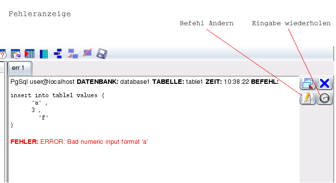 Ist die Eingabe fehlerhaft (z.B. durch Eintrag eines Buchstabens in ein nummerisches Feld) erscheint eine Fehleranzeige. Durch Klicken auf "neue Eingabe" gelangt man wieder zum Eingabedialog und kann eine Korrektur vornehmen. "Befehl ändern" erlaubt es den Insert-Befehl zu ändern und auszuführen.
