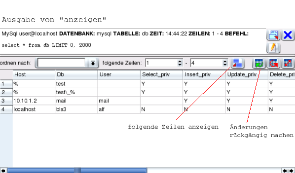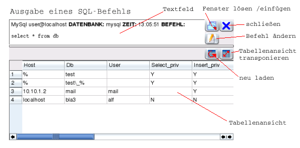 Bis auf die Befehlsliste und die Fehleranzeige unterteilt sich jedes Ausgabefenster in ein Textfeld mit div. Informationen sowie einer Tabellenansicht und enthält u.a. die Schaltflächen: "Fenster lösen / einfügen", "schließen" und "neu laden" (Befehl wird erneut ausgeführt und das Resultat erscheint im gleichen Fenster).