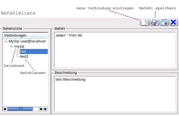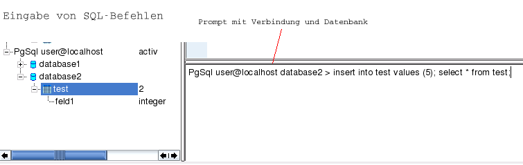Dieses Texteingabefeld dient zum Absetzen von SQL-Befehlen. Der Prompt zeigt dabei die Verbindung sowie die Datenbank an, an die der Befehl geschickt wird. Über die Navigationsleiste kann beides geändert werden.