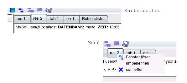 Im Ausgabefenster können neben den Resultaten von SQL-Abfragen die Liste der Felder von Tabellen mit ihren Attributen sowie die Befehlsliste angezeigt werden. Durch drücken der rechten Maustaste auf einen der Karteireiter erscheint ein Menü mit den Punkten "Fenster lösen", "umbenennen" und "schließen". "Fenster lösen" läßt die Ausgabe in einem eigenen Fenster erscheinen und mit "umbenennen" kann der Name geändert werden.